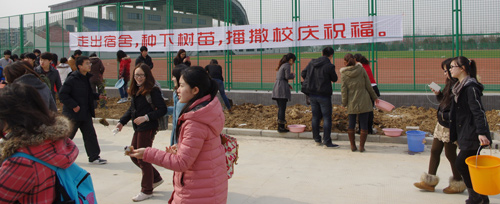 3月12日,我校青年志愿者联合会在仙林校区新运动场外开展了主题为“志愿植树迎校庆我为南邮添新绿”的植树活动。 此次志愿植树活动不仅吸引了众多校庆志愿者的积极参与,也得到了校团委老师及辅导员老师的大力支持与参与,大家铲土浇水,种下一棵棵希望的树苗,并将亲手写下的祝福卡片挂在树苗上,用实际行动为校庆70周年献礼。