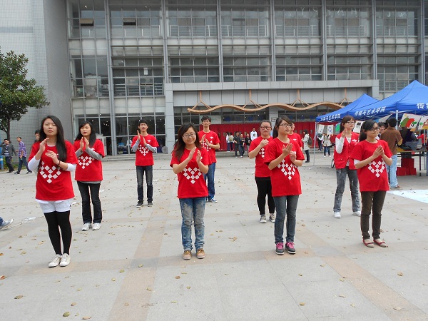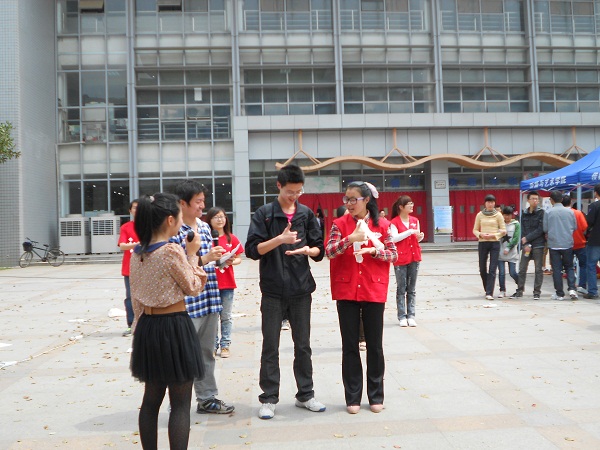 活动当天,南二广场气氛热烈。爱心社成员身着红色的社服,用手更是用心为同学们演绎了一首首动听优美的歌曲,他们认真的表演和耐心的讲解更是赢得了现场同学的尊重和支持。“互动手语猜猜看”和“你我模仿”等多样的互动形式让更多的同学体验了手语的魅力,其中“我爱母校”的手语学习更是吸引了同学们的热情参与。