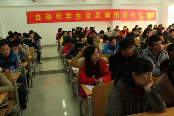 临近期末,为了在全院营造诚信考试氛围,树立良好考风,充分发挥学生党员的先锋模范带头作用,轮盘在线 在本月初启动了学生党员学风考风示范月活动,并于12月14日下午在教四409举行了系列活动之一学生党员诚信签约仪式。轮盘在线 党委副书记高志华老师、党委组织员陈素兰老师、分团委书记叶晓勤老师和2009级辅导员赵梓竹老师以及全体研究生和本科生学生党员参加了签约仪式。