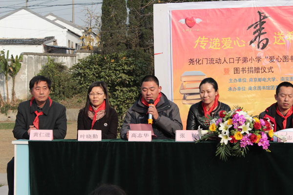 分团委书记叶晓勤和南京图书馆读者服务部主任朱志伟、南京图书馆团委副书记赵曾以及尧化门流动人口子弟小学校长胡德宝和教导主任黄仁进出席了本次仪式。