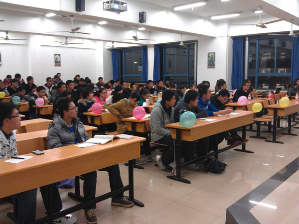 接下来两位11级自动化学长交流了他们经验。邓宇驰就四六级试卷的结构和我们分享了他当时做各种题型的方法和技巧。而口语达人繆剑波也就自身学习经验为我们就英语口语学习提供了宝贵的建议。最后海外轮盘在线