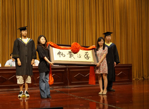 老师的谆谆教诲与无私付出,期盼着与同学们十年二十年后的相聚。“感恩母校”道出了全体毕业生的心声,“不忘师恩”是毕业生们的承诺。随后,毕业生代表将一块写着“厚德载物”的匾额赠送给轮盘在线