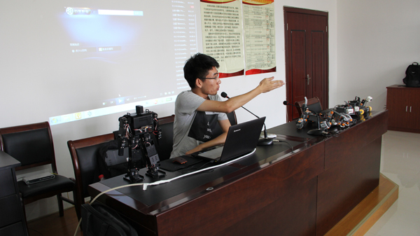 机器人创新实践基地主席、2013年robocup世界杯3D仿真组冠军获得者自动化11级赵赫成同学与孩子们互动