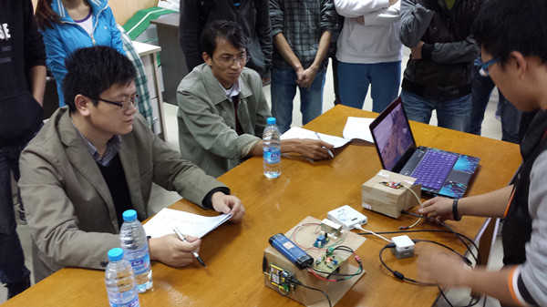 学生共有27支队伍报名参赛,创历届之最,为了争取进入校赛仅有的9个名额,各队选手各显才能,进行了充分的展示,评委老师对每件比赛作品做出了详细的点评和改进的建议。经过近两个小时的紧张评审,入选队伍尘埃落定。其中赖春伶组制作的激光键盘和唐德荣组的智能婴儿车不仅得到两位评委老师的青睐,也赢得了同学的一致好评。