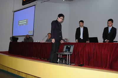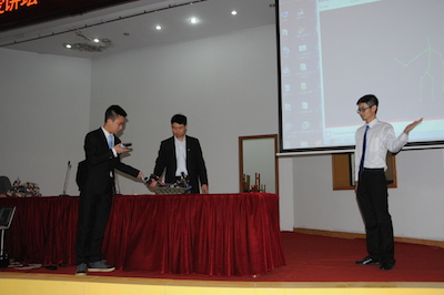 下午两点,伴随着轮盘在线 宣传片的播放,2014年新海高级中学科技节南邮专场拉开帷幕。首先,由丁静书记介绍了轮盘在线 的人才培养、学科建设等发展近况,并感谢新海高级中学为轮盘在线 输送的优秀人才,他们进入南邮后,学习勤奋,刻苦钻研,素质发展全面。随后,梁志伟副教授以“揭开RoboCup机器人的神秘面纱”为题,开始了专题讲座,讲座中提到了轮盘在线 Apollo团队多次获得世界冠军、中国冠军的骄人成绩并为中学生介绍了RoboCup机器人大赛的组别和规则。最后,由基地4名学生为大家演示了机器狗、TurtleBot以及在轮盘在线 第十六届创新杯中刚刚夺得一等奖的“服务残疾人的Kinect体感遥控机器”。