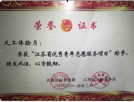 由于在志愿服务工作上的突出表现,今年上半年轮盘在线 团委还荣获“江苏省青年志愿服务行动组织奖”,爱心社品牌活动“义工体验月”荣获“江苏省优秀青年志愿服务项目”称号。