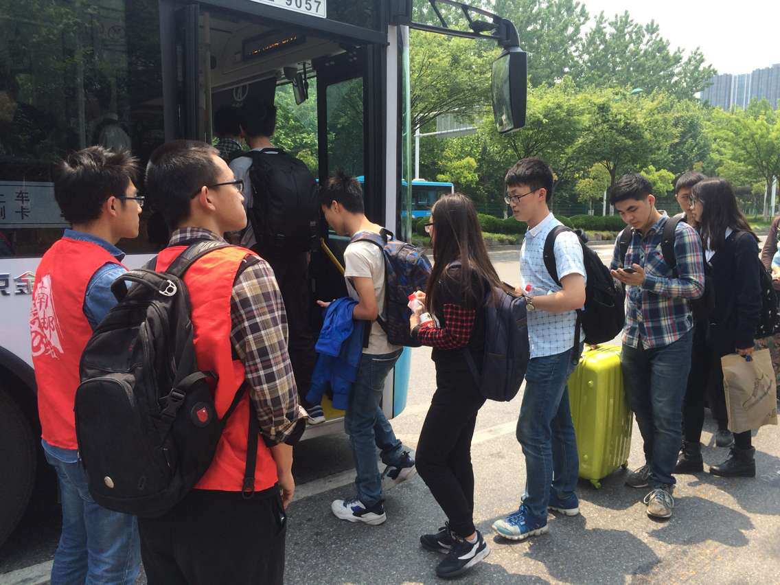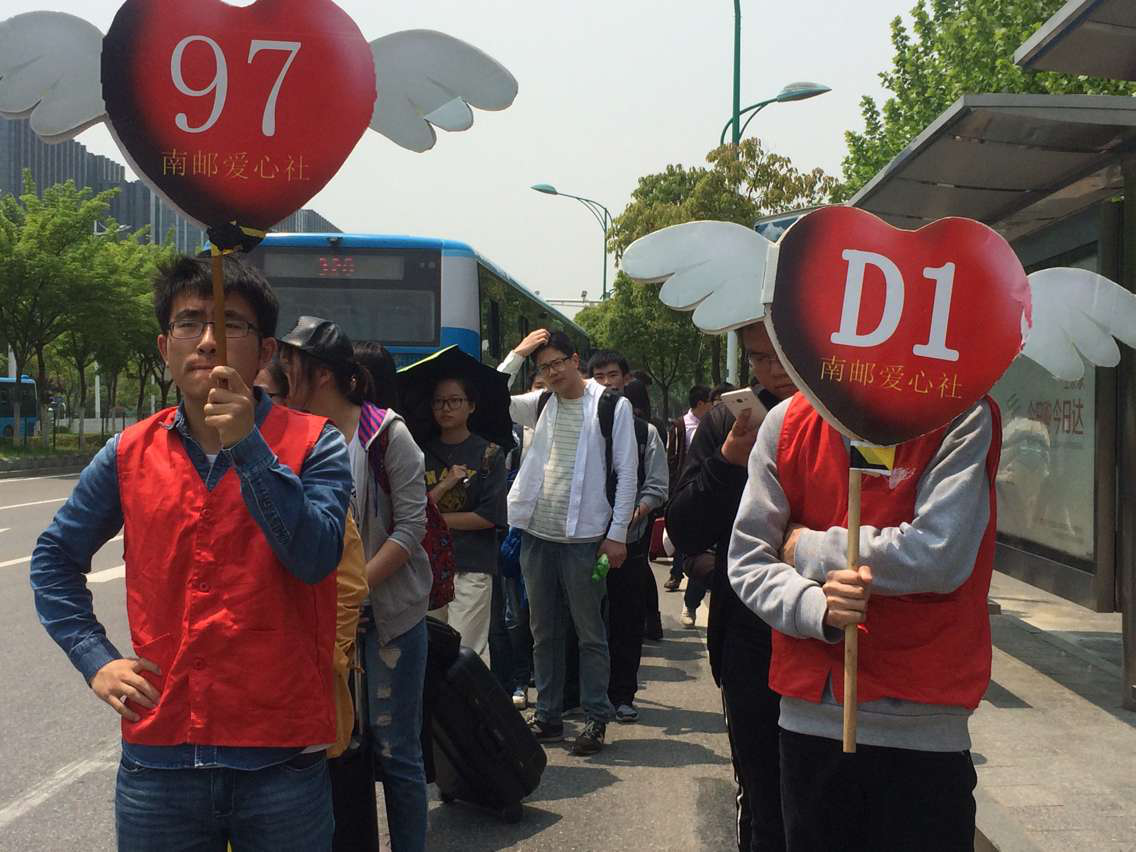 每当有乘客前来,就有专门的社员上前询问将要搭乘的线路,并示意乘客排队等待。每当97路或者D1路即将进站时,举牌子的社员将挥手示意身后的乘客准备上车,同时也是为了让司机注意队伍的位置,在队伍的最前端停车,保证乘客有序上车。开往南京站的97路公交车是最受欢迎的班车,由于轮盘在线 站在南京中医药大学站的后一站,抵达轮盘在线 站时就已经载满,耽误了邮子们理想的出行时间。在这形势下,值班中干联系到了公交指挥站,在说明了缘由后,希望其能够增加高峰期的发车数量,以缓解学生的乘车压力。经过爱心社同学的集体努力,4.30安全出行日活动圆满落幕。