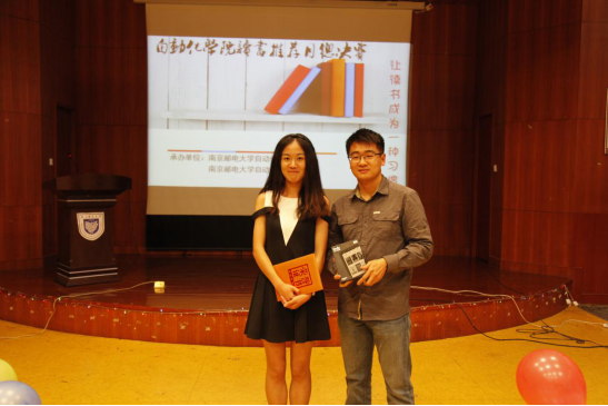 随后,一位选手独特的手绘视频吸引了所有人的注意,她就是来自外国语学院的陆柯柯,她所推荐的作品是《独立日》。她的演讲随性大方,正如她所说,她是一个文艺到骨子里的人,书籍给她带来的影响毋庸置疑。最终,她凭借出色的表现夺得本次比赛的冠军,获得“读书王”称号,张雨新主席为她颁奖并合影留念。