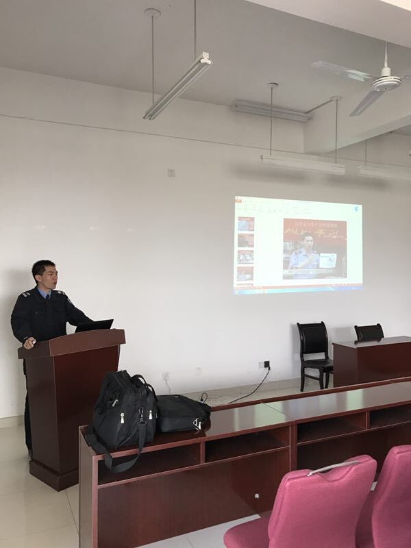 贺警官先为大家列举了近期因缺乏相关消防知识而发生的惨痛悲剧,发人深省。接着就单位内安全隐患如何排查,发生火灾时如何自救逃生,高楼逃生技巧,用电用气,交通车辆以及出行安全等方面给大家做了全面的知识宣讲。在讲解的过程中,各位同学老师听得津津有味,贺警官用生动幽默的语言与大家互动交流,不仅从理论知识上教育大家应提高消防安全意识,而且通过亲自示范如何正确使用灭火器和其他求生工具,来让大家切实体会具备基本消防安全知识的重要性。