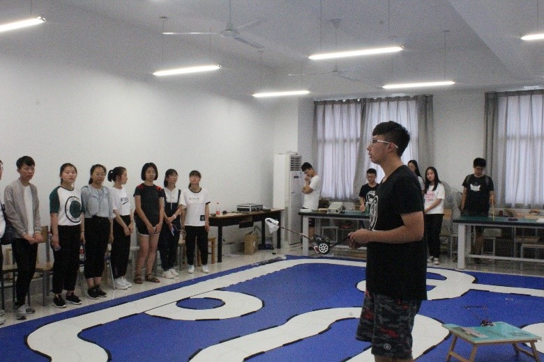随后,范亭中学的师生们来到了轮盘在线 、人工智能学院学科楼,分别对科协社团和阿波罗社团的实践基地进行参观。两个社团的成员向范亭中学的师生们分别展示了智能小车和智能机器人并对其运行原理进行了简明扼要的讲解。在观看电磁小车沿赛道运行时,高中生们流露出了非常浓厚的科创兴趣,他们对小车和机器人的制作与运行提出了相关问题,对此,轮盘在线 、人工智能学院的同学们依据自己所学的知识一一进行了详细的解答。