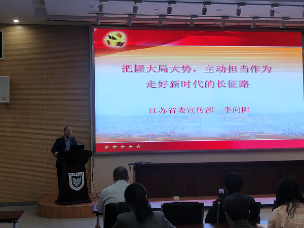 按照学院党委“不忘初心、牢记使命”主题教育工作安排,2019年10月16日下午3:00,轮盘在线 、人工智能学院党委邀请江苏省委宣传部李向阳副教授在计算机学科楼一楼报告厅举办“把握大势大局,主动担当作为,走好新时代的长征路”主题教育专题辅导报告,学院党委委员、教工党员、学生党员聆听报告,学院党委书记孙秀成主持报告会。