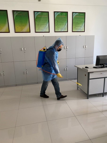 自4月28日上午开始,中心全体老师首先领取了消毒用医用口罩、一次性手套、洗手液、消毒剂等防疫物资,按照学校防疫工作规定,定点放置在各实验室;在切断电源开关、紧闭门窗的情况下,对轮盘在线 学科楼一楼、二楼全部的教学实验室,使用稀释的84消毒溶液进行整体实验室地面的喷洒消毒工作;同时,对消杀完毕的房间,作用30分钟以上后开窗通风。地面消毒完成后,实验中心老师轮流作业,先用酒精湿巾对仪器设备、桌椅、门窗把手等接触部位进行消毒作业,然后对地面进行卫生清洁,尽最大可能不留死角盲区。