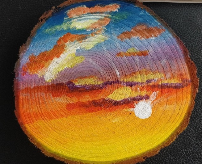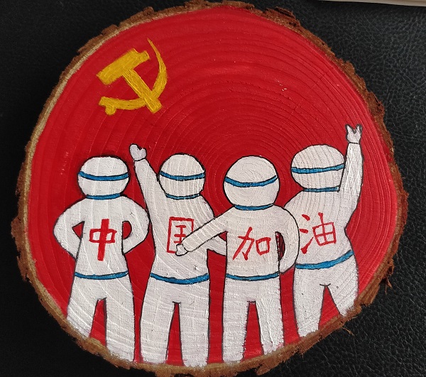 支部创作抗“疫”宣传文创作品,名“拨云见日”。此作品在年轮木桩的正反两面分别做画。正面:四位穿着防护服的医护工作者背后分别写着“中”、“国”、“加”、“油”四个大字,人物头顶画有金光闪闪的党徽,表现了在党是领导和指引下,医务工作者们坚定信仰、不畏艰难、全身心付出的大无畏精神,他们给处在疫情惶恐中的人民群众送来一颗定心丸,亦是抗疫的中坚力量。反面:一轮红日染红了东方天边的云朵,似火的朝霞给人希望,寓意着以广大医务人员为主的全体华夏儿女共同努力奋斗,中国抗“疫”战斗也定将似朝霞般绚丽灿烂,走向胜利。冉冉升起的太阳散发出万丈光芒,这无疑是全体医务人员的自信之光,是全体同胞的希望之光,更是整个中华民族的复兴之光!