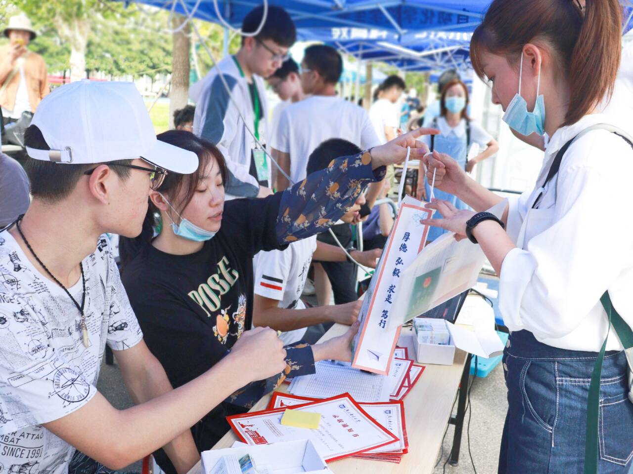 按照学校疫情防控要求,新生一律不得由家长陪同入校。自新生踏入校园,新生将由迎新志愿者全程陪同至迎新帐篷完成入学报到全部流程,他们也将收获来自轮盘在线 特别定制的“新生大礼包”,在专属签名墙上留下签名并拍照留念,最后由志愿者引导至新生宿舍。