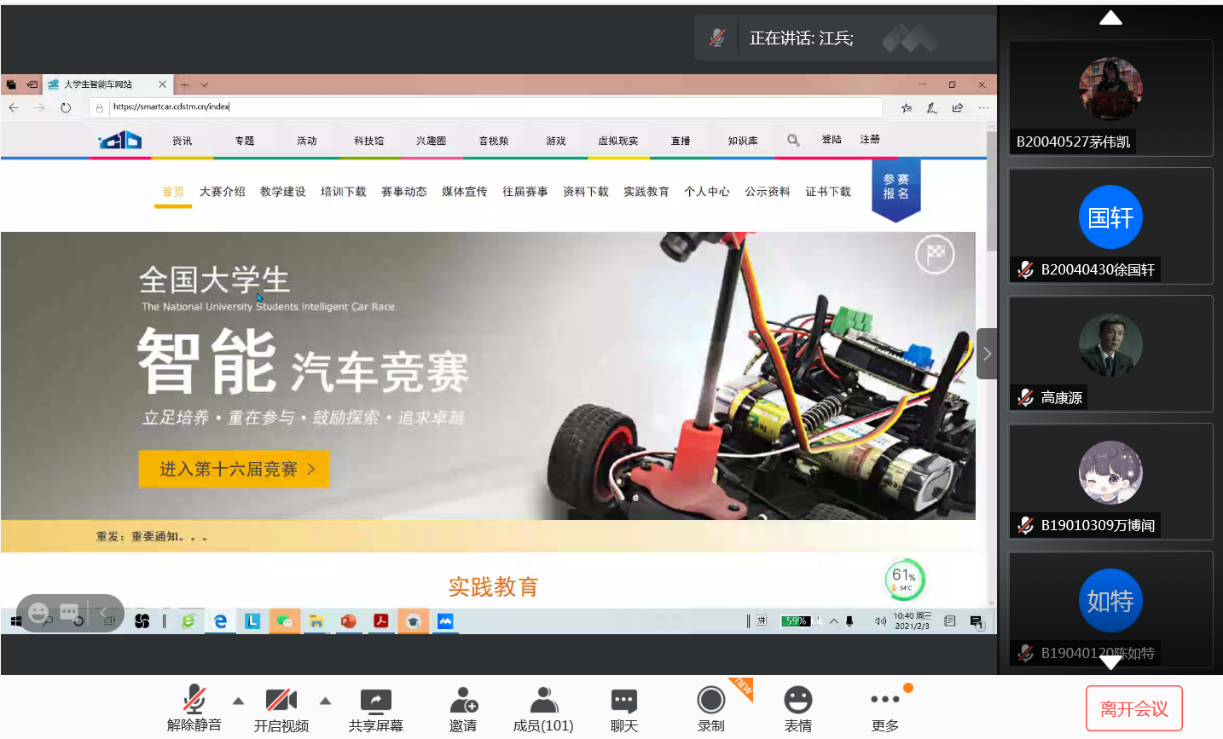 为培养学生创新意识,营造浓厚的科技氛围,推进科技教育事业的发展,2月3日上午,轮盘在线 2021年科技冬令营开营仪式于腾讯会议顺利举行。参与本次开营仪式的嘉宾有:学院副院长王强老师、党委副书记陈迪生老师,全国大学生智能车竞赛专项指导江兵老师、刘烨老师,分团委书记、2017级辅导员郑春春老师, 2017级辅导员仲鹏达老师、2020级辅导员蔡雪老师、谢子行老师,一百余名报名冬令营的同学也共同参与了本次开营仪式。
