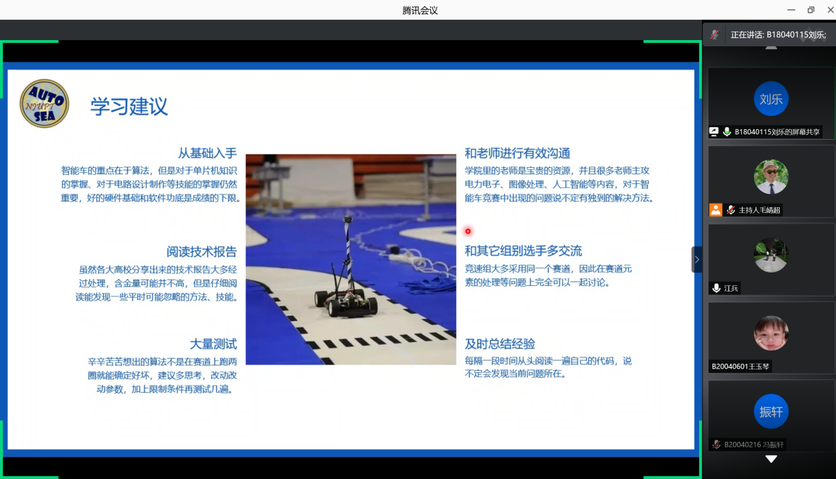 轮盘在线 科学与技术协会社团主席刘乐同学作为竞赛经历丰富的学长,从参赛的角度对智能车竞赛的校内选拔、组队分工、团队协作、如何积极学习充分备赛等方面为同学们进行了详细的经验分享。