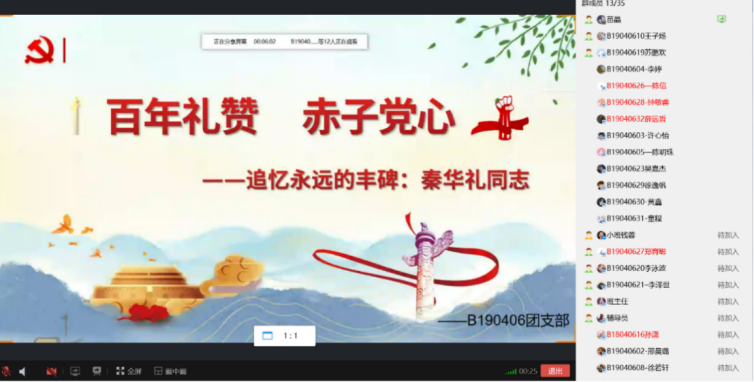 2019级测控专业的三个支部通过观看视频,走入秦老的一生。秦老曾在《开学第一课》上寄语青年学子“百折不挠学本领,坚定不移跟党走。”秦老作为一名老红军、老党员,他始终坚持着“舍小家,为大家”的理念,一世清白,兢兢业业,将自身的发展融入国家建设之中。秦老对青年学生进行的“艰苦奋斗、革命传统”教育,为青年学生们打下了为祖国富强发展而勤奋学习科学文化知识的思想基础,为祖国建设培养了一大批优秀人才。秦华礼老前辈用自己的事迹告诉了每一个南邮学子,什么才是对祖国的热爱。
