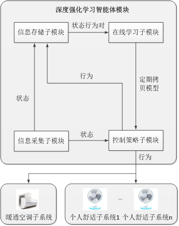 关键技术: 为了克服现有控制方法不足,我们设计了基于深度强化学习技术的共享办公区域个性化热舒适控制系统及方法。具体而言,设计的个性化热舒适控制系统包括暖通空调子系统、个人舒适子系统、与暖通空调子系统、个人舒适子系统连接的深度强化学习智能体模块。暖通空调子系统由分体式室内机和室外机组成,具有用于自动设置空调温度设置点的无线执行器模块,暖通空调子系统用于调节多用户共享办公区域的内部温度。个人舒适子系统由具有无线执行器模块的桌面风扇或/和加热装置组成,个人舒适子系统用于调节其关联用户周围的微环境。上述两类系统协同工作,共同为多用户提供差异化的热舒适体验。深度强化学习智能体模块包括信息采集子模块、信息存储子模块、在线学习子模块和控制策略子模块。信息采集子模块使用传感器等手段获取共享办公区域的当前室内外温度、每个用户座位占用情况、电价、时间等状态信息,将状态信息发送给控制策略子模块和信息存储子模块。信息存储子模块接收信息采集子模块发送的环境状态信息和控制策略子模块发送的执行行为信息,将信息进行存储。在线学习子模块部署在云端服务器或本地服务器,以暖通空调子系统与个人舒适子系统能量总成本最小、未来的期望折扣奖励最大化为目标,从信息存储子模块中定期抽取小批量数据并利用深度强化学习算法对其内部的深度神经网络进行训练。控制策略子模块能够基于环境信息,输出暖通空调子系统与个人舒适子系统的协同行为,将协同行为信息发送给所述暖通空调子系统和所述个人舒适子系统进行执行。控制策略子模块将执行行为信息发送给信息存储子模块、暖通空调子系统以及个人舒适子系统并定期从在线学习子模块拷贝训练后的深度神经网络模型,能够保证输出暖通空调子系统与个人舒适子系统的协同行为决策更有效。本发明提出的个性化热舒适控制技术无需知晓明确的建筑热动态性模型和任何不确定性参数的先验信息,而且采用了注意力学习机制实现高可扩展性(即个人舒适系统的增加并不会影响本发明技术的有效性)。