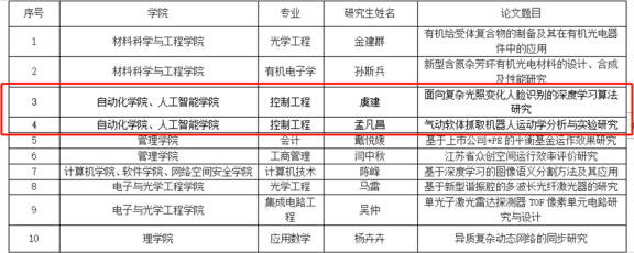 近日,江苏省学位委员会、江苏省教育厅公布了2021年江苏省优秀博士硕士学位论文评选结果,其中轮盘在线 、人工智能学院虞建同学的《面向复杂光照变化人脸识别的深度学习算法研究》和孟凡昌同学的《气动软体抓取机器人运动学分析与实验研究》入选江苏省优秀硕士学位论文名单,这是轮盘在线 、人工智能学院在省优秀博士硕士学位论文评选中取得的又一佳绩。