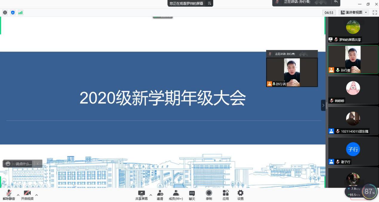 会议伊始,孙书记向全体学生提出新学期要求和期望:一、团结友爱同学,营造良好学风。认真听讲,遵守网络课堂纪律,可以以寝室、班级为单位搭建团结互助学习平台。学生干部和党员要积极发挥作用,主动帮助有困难的同学,协助老师开展好教学服务工作;二、做好疫情防控,打扫宿舍卫生。同学们要遵守疫情防控相关政策要求并做好自身防护,积极配合每天线上健康打卡。开学期间保证寝室内务整洁卫生,遵守寝室安全管理规定,杜绝安全隐患,营造良好安全的生活环境;三、遵守校纪校规,谨防电信诈骗。同学们要提高反诈骗能力,增强防范意识,不轻信陌生人,不泄露个人信息,避免掉入诈骗陷阱,遇到大额转账请及时联系老师;四、做好生涯规划,努力拼搏奋斗。同学们应树立正确的择业、就业观念,科学规划职业生涯,以自身经历激励同学们明确自己的奋斗目标和努力方向,努力提升就业能力;五、积极参与活动,锻炼综合素质。同学们从专业、兴趣出发,从力所能及的小事做起,坚定理想信念,锻炼扎实本领,锤炼品德修为。最后,孙委委表示各位同学生逢盛世,肩负重任,应成长为立大志、明大德、成大才、担大任的新时代大学生。