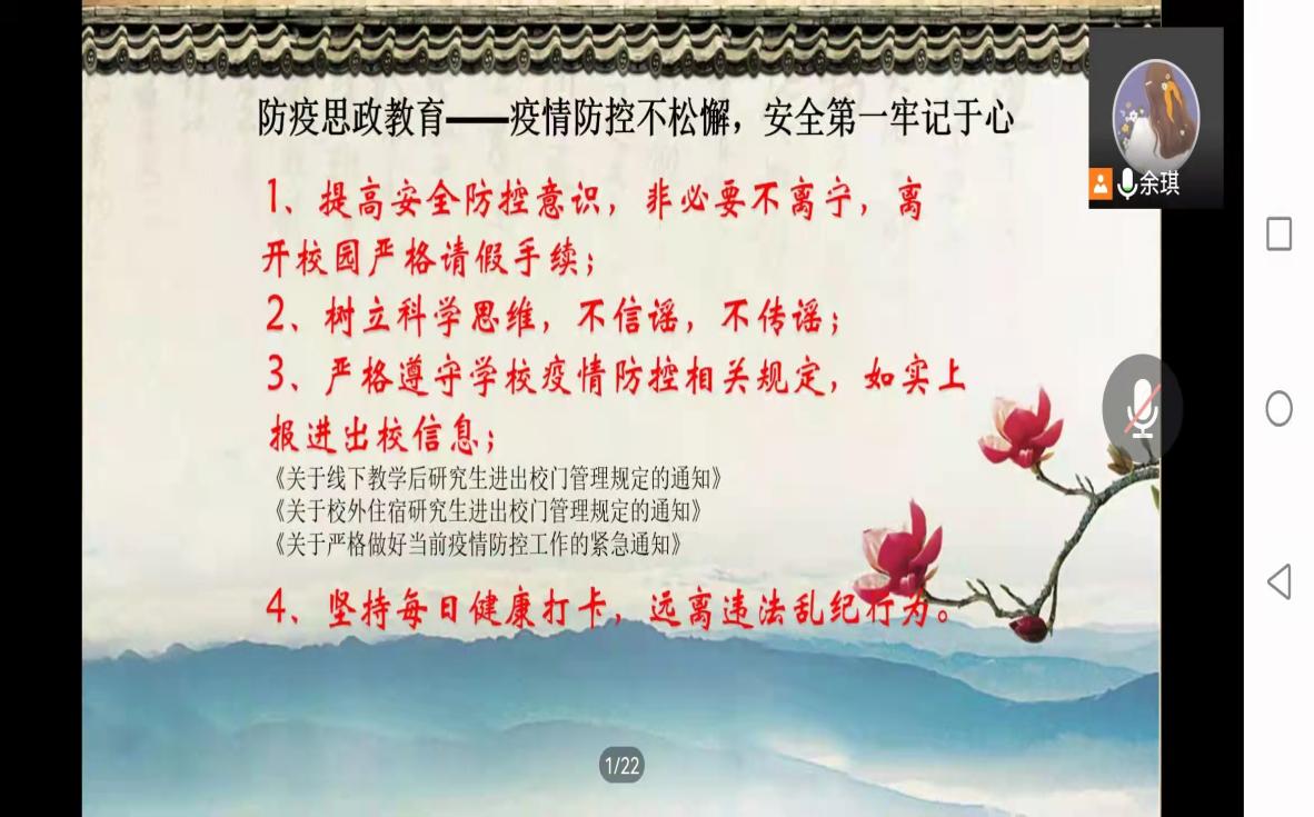 随后,20级研究生辅导员余琪老师从防疫思政教育、安全、心理健康以及学术道德规范四个方面进行了讲述,同时结合研二学生现阶段的困惑和规划提出具体建议:一是端正科研态度,加强与导师的沟通交流,重视科研积累的过程;二是积极关注自身心理状况,适当掌握心理调节技能,学会主动寻求帮助,努力营造良好的人际关系;三是提前做好职业规划,认清就业形势,做到务实、理性的求职和择业;四是恪守学术道德,捍卫学术尊严,做学术道德的践行者、优良学风的引领者和良好学术环境的建设者。