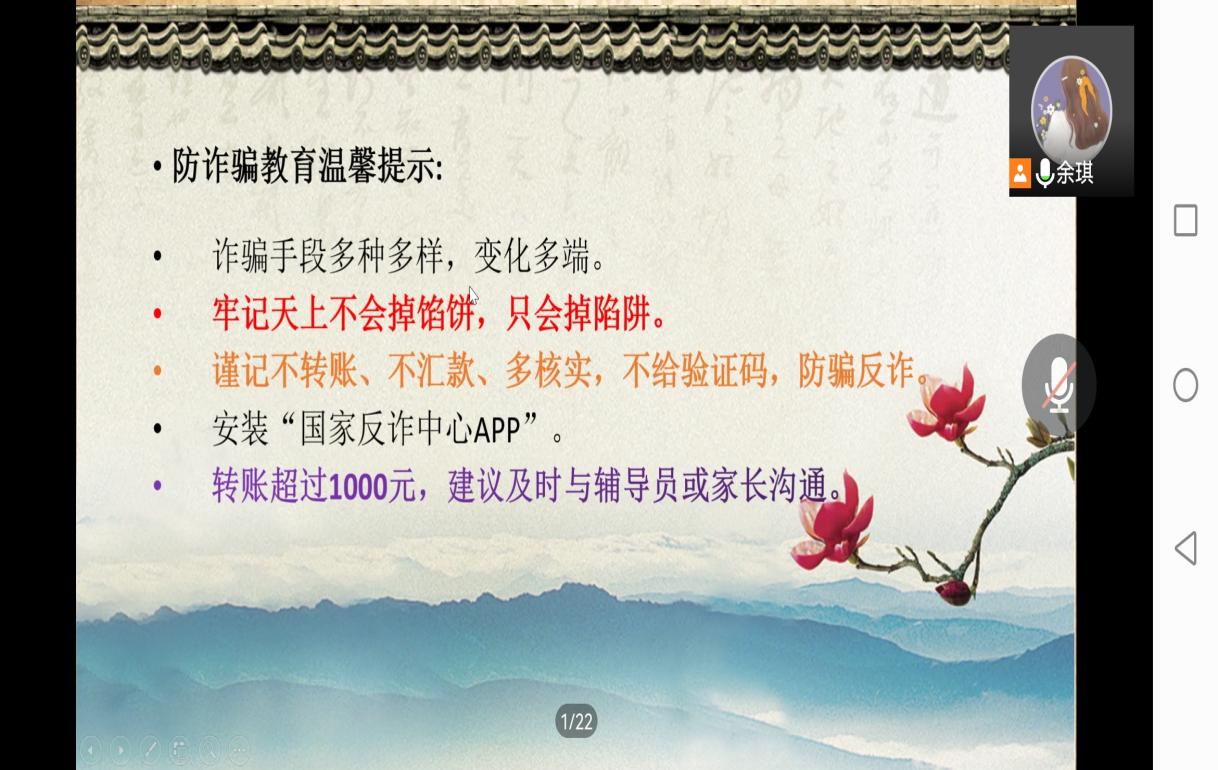 会议伊始,孙书记向各位同学表达了亲切的关怀,并再次强调了目前国内疫情形势的严峻性,解读了学校疫情防控的管理规定,同时要求各位研究生同学在此特殊时期要增强责任意识和底线思维,在做好个人防护的基础上,努力学习本领,增强个人才干。而后通过案例分享和互动的形式,积极引导同学们树立安全意识,预防电信诈骗。最后,孙书记表示希望各位同学在新时代的浪潮里乘风破浪,不负韶华,在奋斗中激荡青春力量。