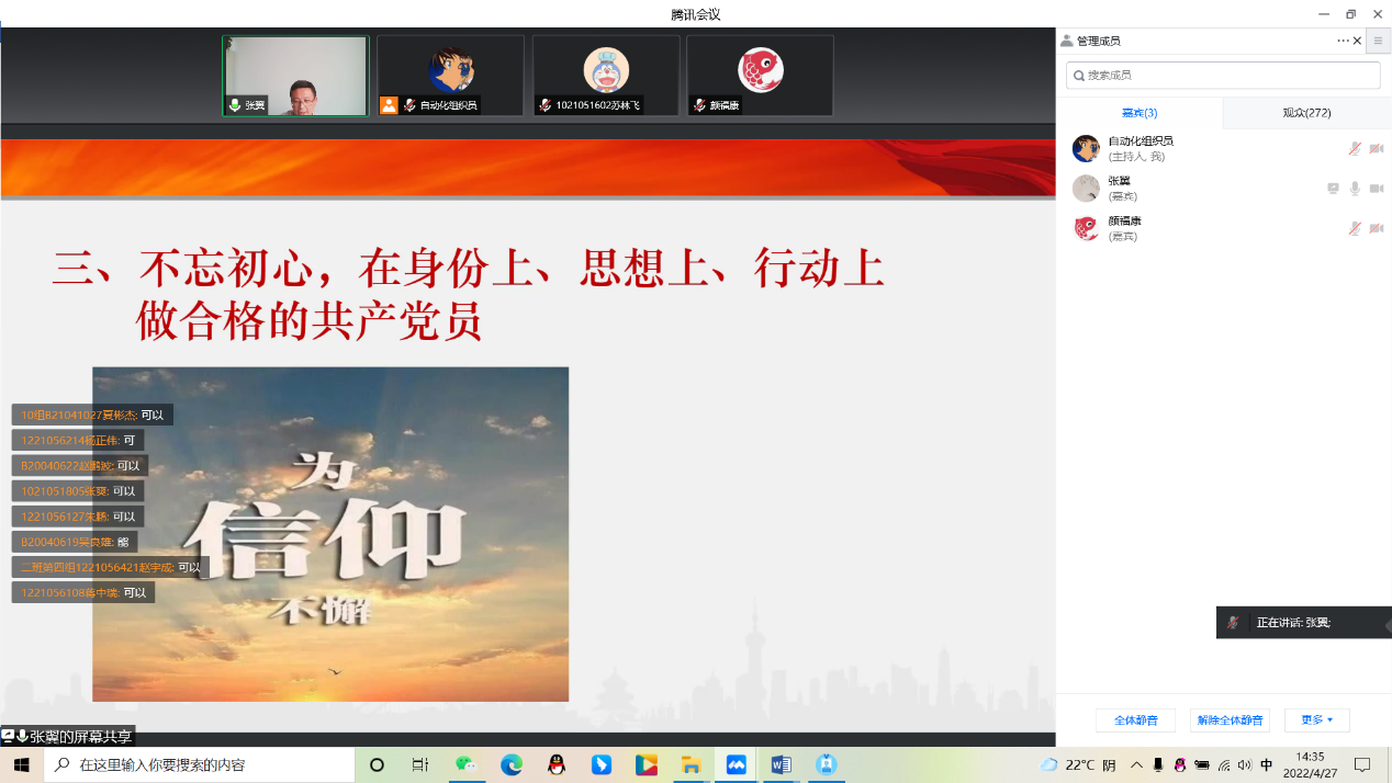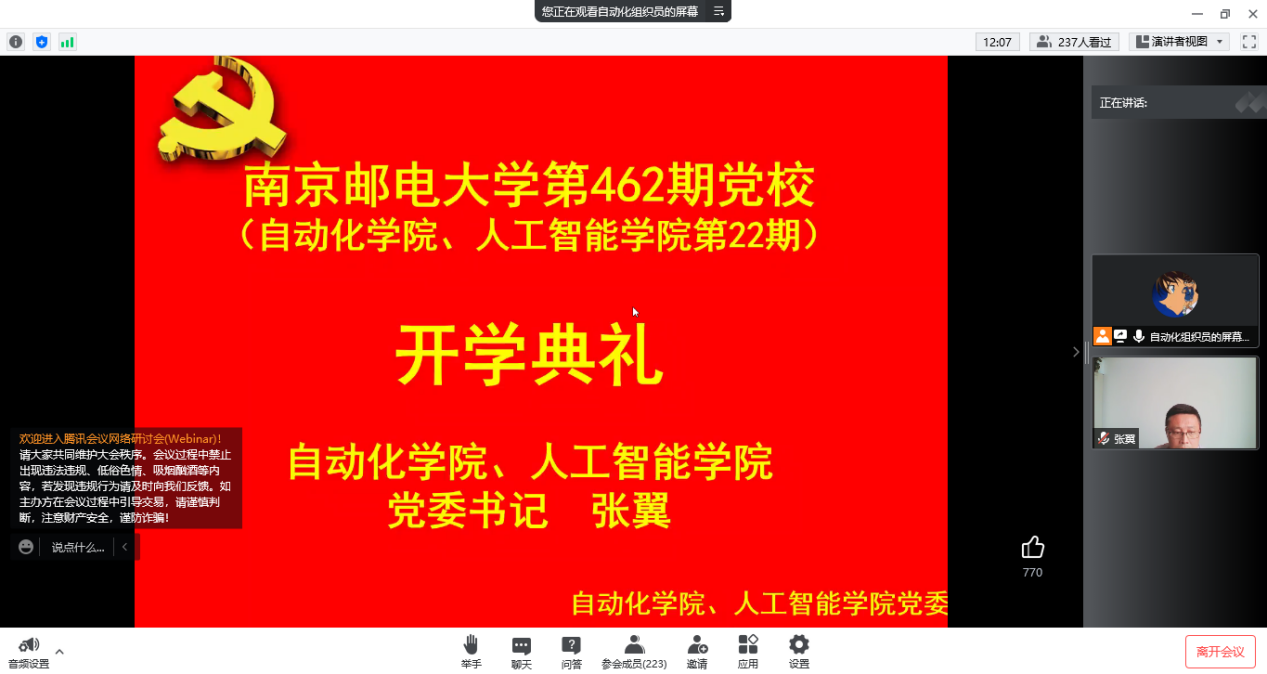 2022年4月27日,轮盘在线 第462期暨轮盘在线 、人工智能轮盘在线 第22期入党积极分子党校培训班顺利开班。轮盘在线 党委深入学习贯彻习近平总书记关于疫情防控的重要指示精神,坚决落实中央、省委疫情防控决策部署和校党委具体要求,本期培训班教学活动采用线上形式举行,由轮盘在线 、人工智能轮盘在线 党委书记张翼主持。