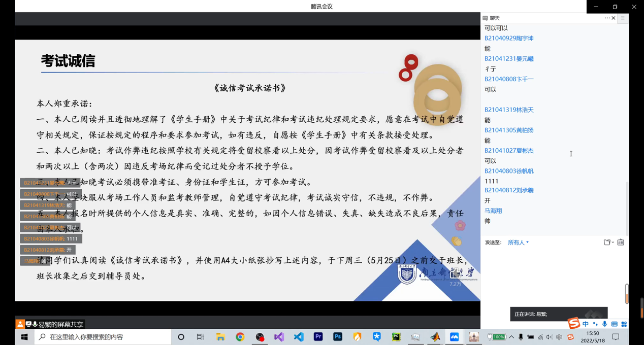 考试临近,本次诚信教育着重进行了诚信考试的教育。首先是辅导员们详细解读了学校关于考试纪律和考试违纪处理规定,随后又再次强调在任何考试期间都要诚信应试、不可作弊。会后,各班同学由班长组织,再次重温了诚信考试的重要内容,同时通过手抄诚信考试承诺书的方式,完成了本次诚信教育。