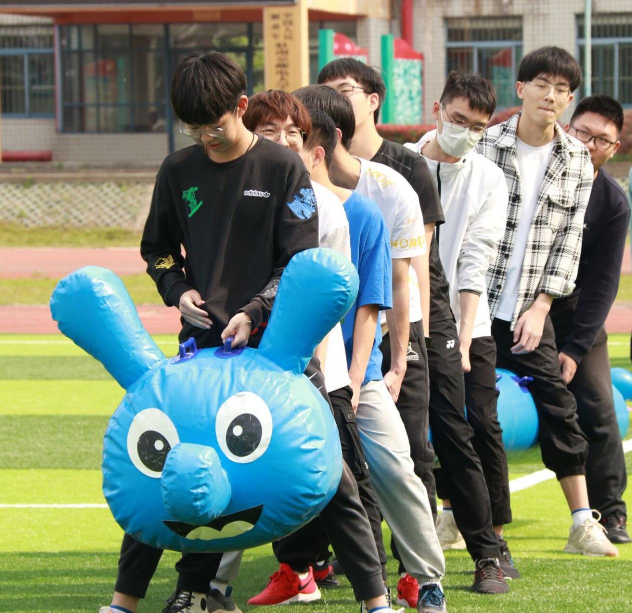 第二个游戏——毛毛虫竞速。团队成员骑在毛毛虫上,双手把住固定把手,立于起跑线后,裁判发令后,队员通过协调配合使充气毛毛虫在草坪上行进,赛程30米,往返一次,用时最短者为胜。同学们相互配合,虽然有成员跟不上队伍的脚步,不过他们重新快速站起来,调整策略继续比赛。赛场外,欢笑声、呐喊声不绝于耳,充分体现了“友谊第一,比赛第二”的体育精神。