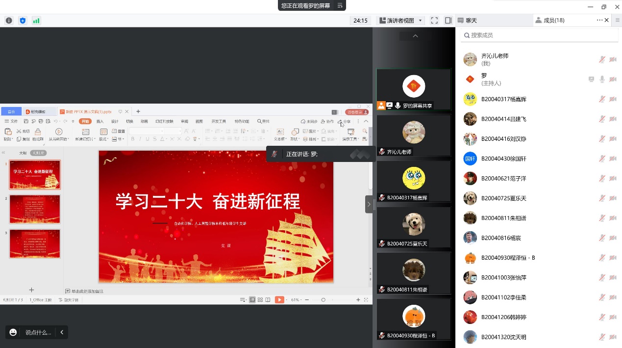 随后,罗帅老师向同学们普及了党的二十大的历史背景和重要意义,深刻解读新时代十年的伟大变革和历史性飞跃。以新时代新征程下中国共产党的中心任务为出发点,从新发展格局、科教兴国、人民民主、依法治国、绿色发展等多个维度解读党的二十大报告重点内容,带领同学们学习党的二十大报告中的新表述、新概括和新论断,同时 号召轮盘在线学子为党和国家的事业发展贡献青春力量。