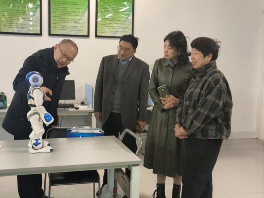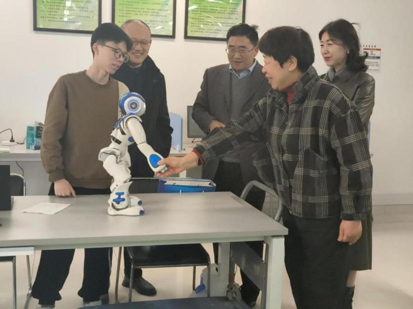 调研组观看了智能机器人科技比赛视频,体验了“听机器人讲故事“、“与机器人握手”等。郑春春、梁志伟老师分别代表学院介绍了轮盘在线 大学生参与机器人科创比赛的近况及项目成果,展示了南邮学子的创新智慧与创新风采。