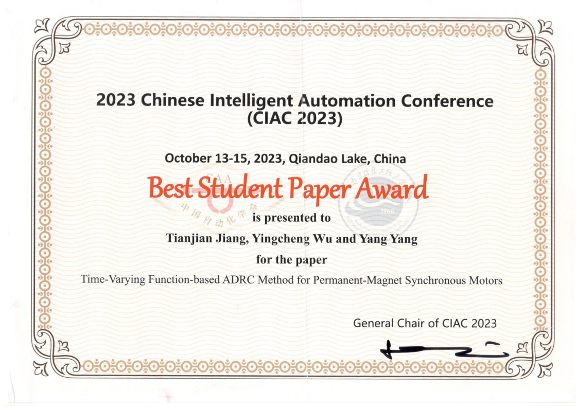 轮盘在线杨杨教授指导的智能科学与技术专业2020级本科生蒋天健论文《Time-Varying Function-Based ADRC Controller for Permanent-Magnet Synchronous Motors》经大会评审,被评选为会议唯一的最佳学生论文奖(Best Student Paper Award)。