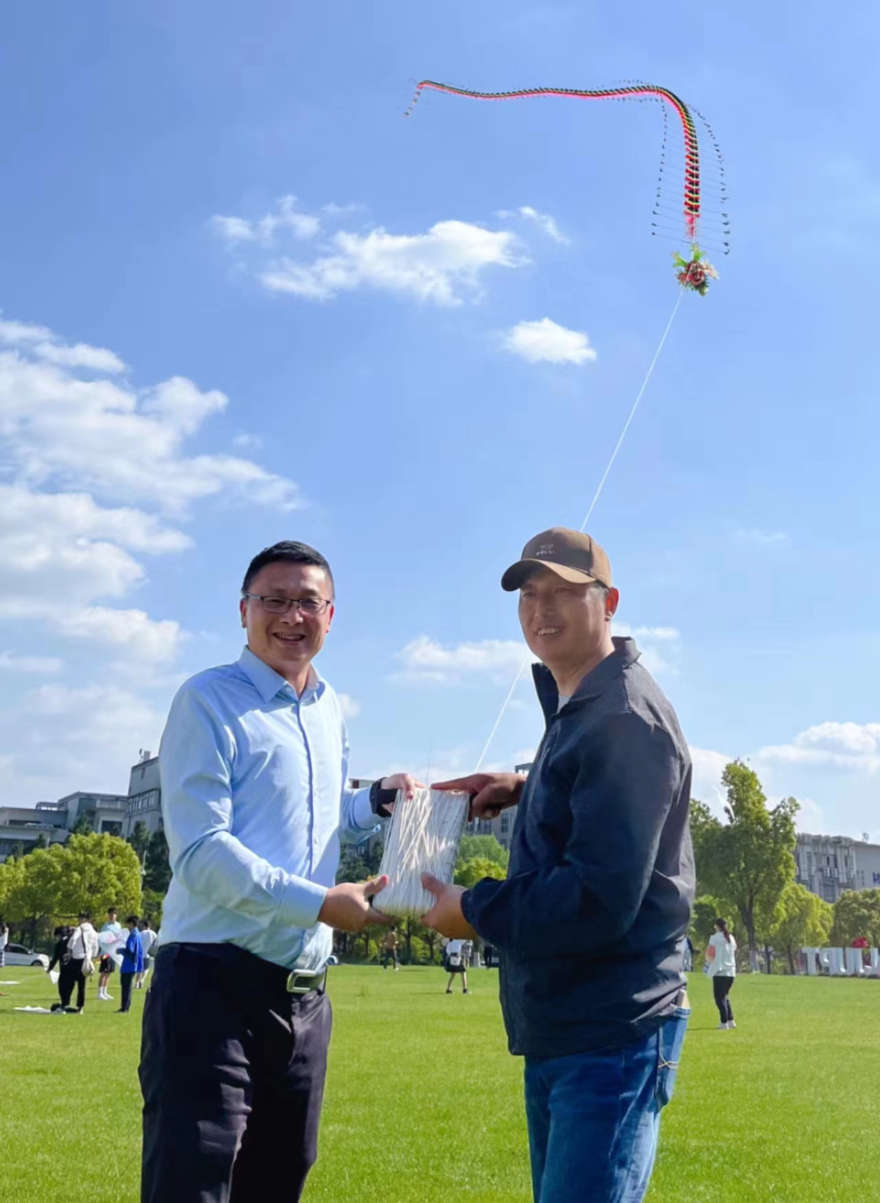 电光柔学院2021级本科生陈言、郭础铭两位同学说:“我们很享受此次活动,是难得的放松身心、拓展技能的机会。作为全场DIY风筝放得最高的队伍,我们觉得风筝能飞这么高需要眼明手快、手脑并用,以及不断摸索尝试,动手制作和成功放飞给我们的获得感是无与伦比的”。