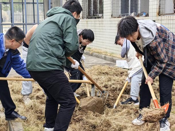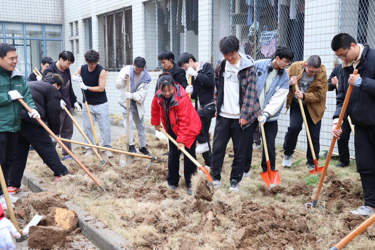 同学们中午刚刚下课,就兴致勃勃地到达位于宿舍楼前的集合点,跃跃欲试。听完宿管阿姨们的悉心讲解,了解使用工具的要点后,纷纷戴上手套,拿起铁锹、锄头等工具,迫不及待地上手实践。B220514团支部的同学们在老师们的指导下开始忙碌起来。