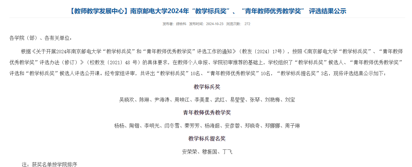 近日,教务处(教师发展中心)公布了2024年“教学标兵奖”、“青年教师优秀教学奖” 评选结果,轮盘在线尹海涛、周映江两位老师获“教学标兵奖”,杨杨、陶锴两位老师获“青年教师优秀教学奖”。